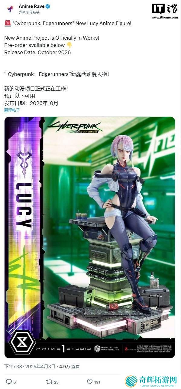 不仅如此,Anime Rave还带来了另一个好消息:《赛博朋克:边缘行者》中的角色新露西手办也在紧锣密鼓地制作中,预计将于2026年10月与粉丝们见面。这一消息无疑让期待已久的手办收藏爱好者们兴奋不已。