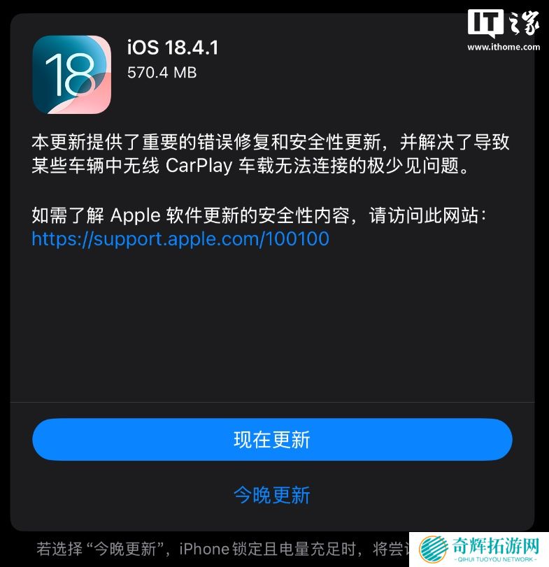更新日志显示,iOS 18.4.1 正式版提供了重要的错误修复和安全性更新,并解决了导致某些车辆中无线 CarPlay 车载无法连接的极少见问题。