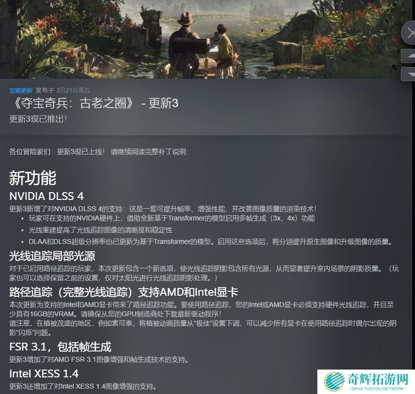 《夺宝奇兵:古老之圈》最近一次更新是在今年2月21日,名为“更新3”的补丁为游戏加入了DLSS 4、FSR 3.1(含帧生成)和英特尔XESS 1.4技术。DLAA和DLSS超级分辨率已更新为基于Transformer模型,RTX 50系玩家可基于Transformer的模型启用多帧生成(3x、4x)功能。