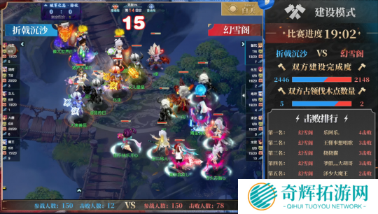 周五建设环节开启后,【折戟沉沙】因伐木队伍较多,在建设进度上对【幻雪阁】形成压制。不过,【幻雪阁】凭借出色的进攻能力,在击败人数方面占据优势。