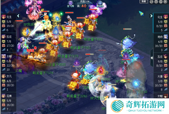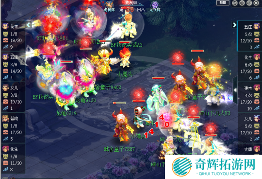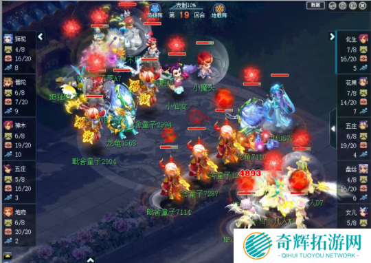 50回合狂吃不肥五庄开始给3输出加上天地同寿来免疫封印,节约五龙丹,但这也给山下凡人机会,山下凡人花果利用速度优势飞机不断击倒狂吃不胖的输出,给狂吃不怕拉人的压力,逼迫其将所有攻宝宝全部换成拉人孩子。