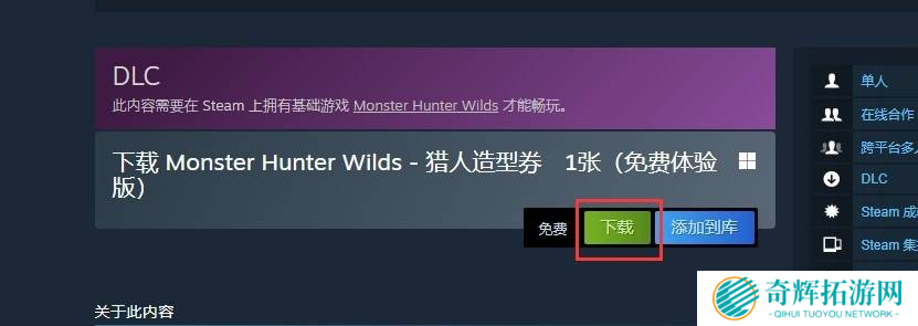 点击“猎人造型券”或“随从造型券”DLC的页面,选择“下载”即可成功领取。