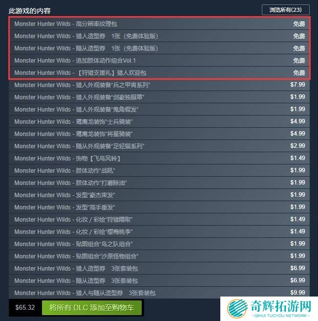 在游戏的DLC列表中,可以看到有多项免费内容,其中包括: