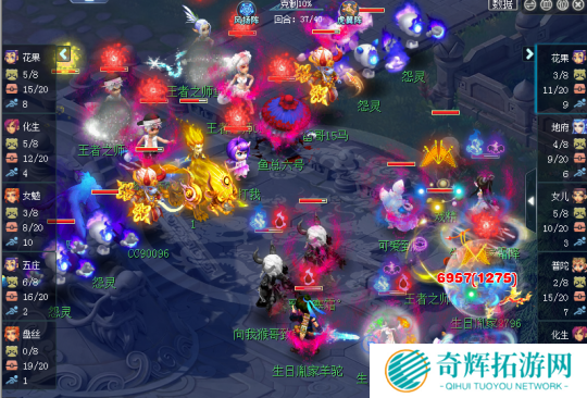 18回合,珍宝阁花果山起来后直接双旗,五庄给其加上天地同寿防小死亡,并拉出**善恶对生日快乐花果山进行压制。生日快乐对珍宝阁花果进行了2次压制后,便放弃了,光是解封解禁疗都耗费了大量的操作。