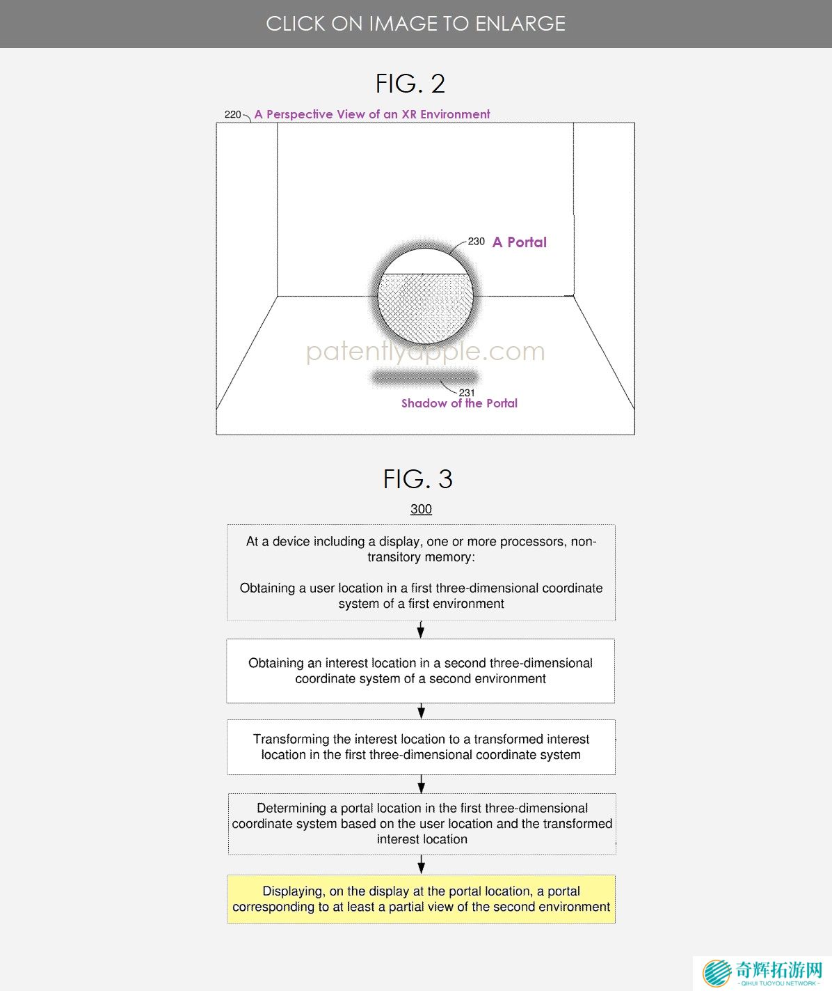除了重影补偿,苹果的另一项 HMD 专利聚焦于“动态门户”(Dynamic Portals)技术。该技术允许设备在不同三维环境中切换视角,通过获取用户在第一环境中的位置和第二环境中的兴趣点,计算并显示一个门户窗口,使用户能部分查看第二环境。