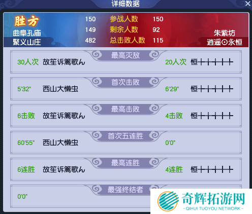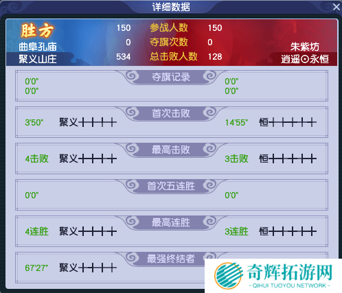 单就赛后数据来说,双方在同时出战150人的情况下,【聚义山庄】拿到了482个击败,是【逍遥⊙永恒】4倍,且比赛结束时,【聚义山庄】仅有一人出局。这就表明,【聚义山庄】在团队硬实力上有压制性优势,只要在周日夺旗环节中做好防守,就有卫冕冠军的可能。