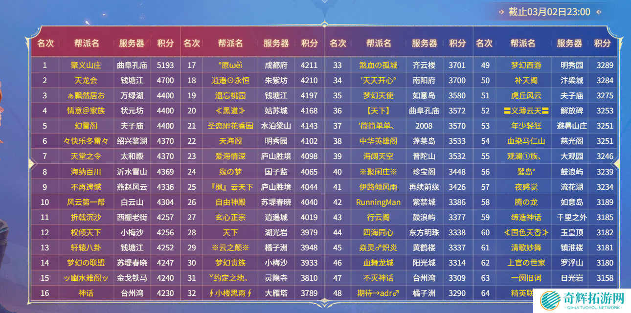 目前,梦幻西游第28届帮派联赛已经落下帷幕,来自曲阜孔庙服务器的【聚义山庄】凭借强大的击败,以2:1的比分压制朱紫坊服务器的【逍遥⊙永恒】,成功卫冕帮派联赛冠军。下面,就带大家复盘一下吧!