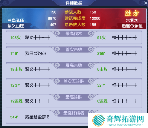 从赛后数据来看,虽然【聚义山庄】拿到了497个总击败,但在建设进度上却落后了1130点。这就表明,【逍遥⊙永恒】虽然击杀能力较弱,但其团队凝聚力非常强。要知道,【聚义山庄】的497个击杀相当于让【逍遥⊙永恒】所有参赛人员阵亡了3次,在这样的劣势面前依然能保住建设进度,实属值得尊重!