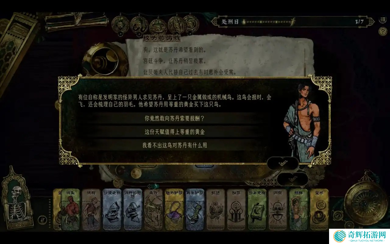 这份天赋值得黄金:获得事件“黄金鸟”,花费三十金币,可以消除任意等级奢靡卡。上朝时将黄金鸟献给苏丹可以增加五点权势。(黄金鸟不给苏丹不会有任何后果,目前黄金鸟没有其余作用,在娜依拉的升华事件中可能可以用还没有试过),黄金鸟事件限时七个回合,时间结束后事件消失没有其余后果。