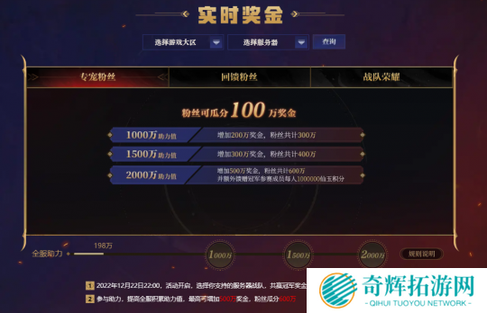 奖金分配方式也调整为“专宠粉丝、回馈粉丝、战队荣耀”三种,不同的分配方式也对应着不同的奖金池。其中“专宠粉丝”奖金最高,粉丝可瓜分最高600万元战队奖金,“战队荣耀”则由战队获得百万奖金,粉丝瓜分助力奖金。