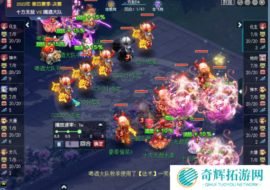 最终23回合,十方无敌持续飞秒配合3谛听轰炸,生日胤家全员倒地,生日快乐女儿试图喝酒慈航,但是被十方无敌拉上速度圈笑掉,最终无奈止步8强。