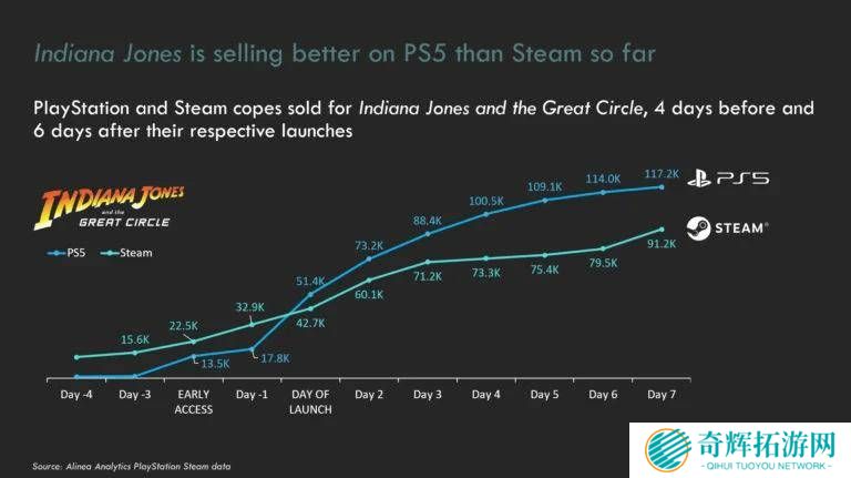 据Alinea Analytics的销售数据估算,尽管《夺宝奇兵:古老之圈》在PS5上晚于Steam和Xbox平台发布,但其销量却后来居上。截至2025年4月23日,该游戏在PS5上市仅六天内便售出了11.72万份,相比之下,Steam版本在相同时间段的销量仅为9.12万份,显示出PS5版本高达28%的增长优势。