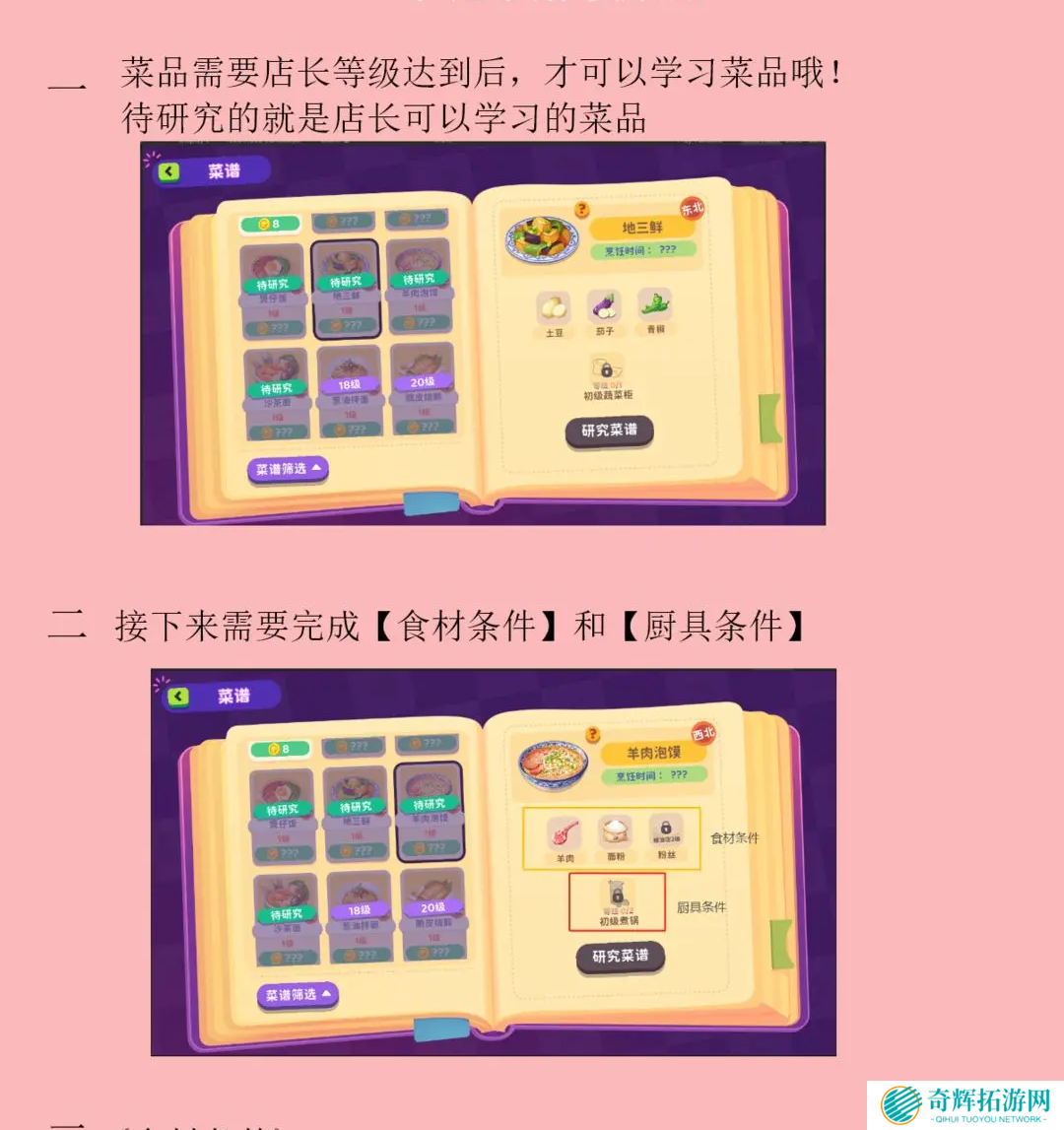 2、想要研发新菜品,店长必须先达到对应等级,这样才能解锁待研究的菜谱。