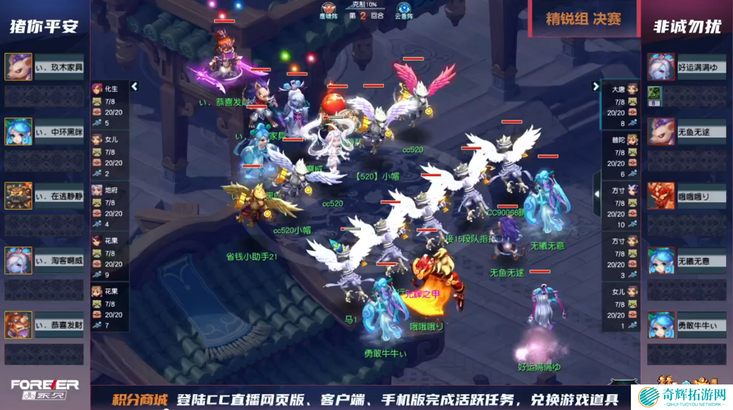 精锐组的决赛在猪你平安同非诚勿扰之间展开,猪你平安采用了化生、女儿、地府、双花果山的双物理点杀阵容,非诚勿扰则是选用了大唐、普陀、方寸、魔方寸、女儿村的国标阵容。