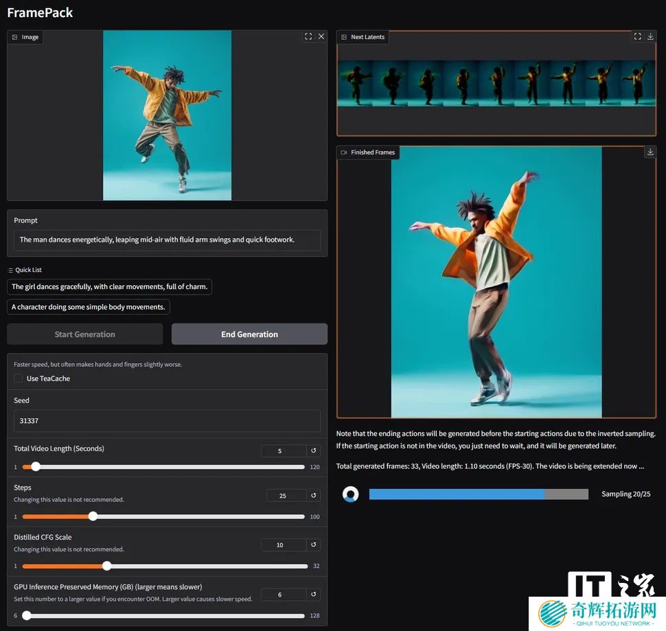 目前,FramePack 所使用的模型可能有 30 帧 / 秒的上限,这或许会限制部分用户的需求,但 FramePack 的出现无疑为普通消费者进行 AI 视频创作铺平了道路,提供了一种替代昂贵第三方云服务的可行方案。即使对于非专业内容创作者,这项技术也为制作 GIF 动图、表情包等娱乐内容提供了有趣的工具。