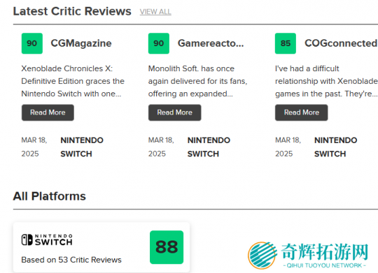 经典名作重制新篇,《异度神剑X 终极版》即将于明天3月20日登陆Switch正式发售,M站发布了评价报告,总计52家媒体参与评价,其中29家给出了90份以上的好评,平均分88。