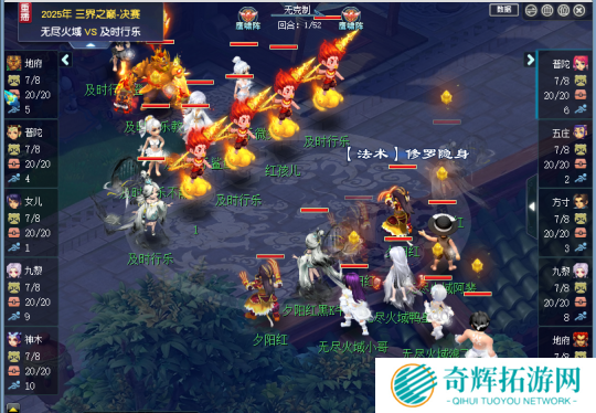 44回合,无尽火域再次点杀成功击倒及时行乐九黎,无尽火域火力全开,及时行乐只能全体起盾硬抗,但是完全无法抵抗无尽火域的输出,随后无尽火域换出瞬法须弥,最终52回合,成功清场拿下三届之巅冠军。