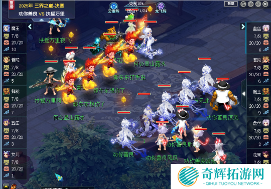 19回合,扶摇万里感觉到了压力,配合金蝉脱壳宝宝换出2波须弥冲刺,打断了劝你善良花果的出手,但是劝你善良接上罗汉并清掉对手2波须弥,并不慌张,21回合劝你善良趁着对手狮驼没有变身,反手换出须弥冲刺,瞬间击倒扶摇万里狮驼、女儿、五庄,随后利用速度优势控住狮驼尸体不让其招宝宝,24回合成功清场拿下三届之巅冠军!