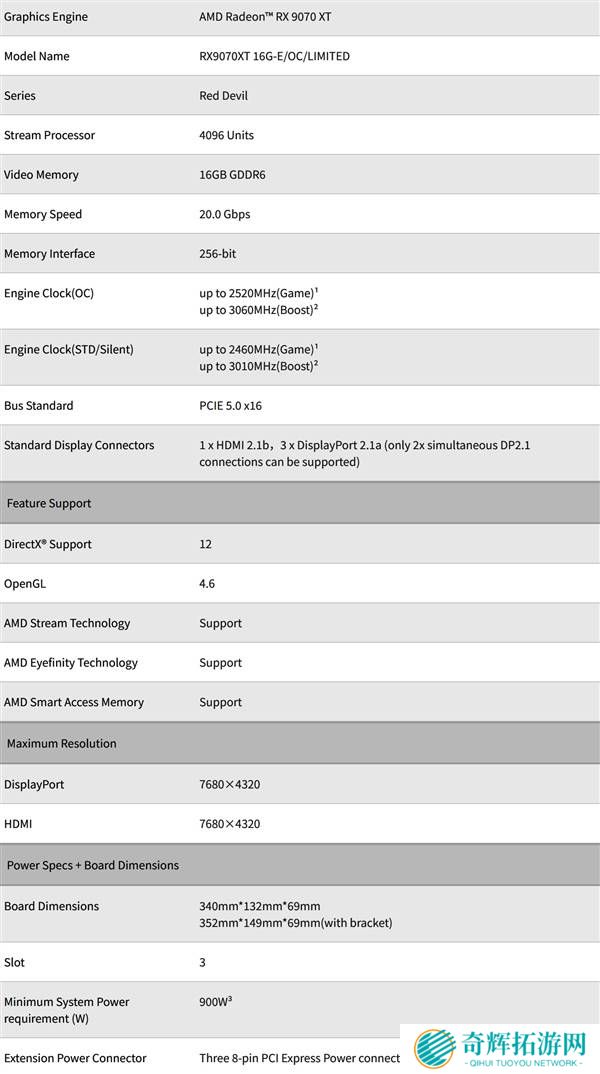 在规格参数方面,这款白色特别版红魔显卡与标准版完全一致。它采用了三插槽身材,标准频率范围在2460-3010MHz之间,超频模式频率可达2520-3060MHz。显存频率为20GHz,配备了三个DP2.1a和一个HDMI 2.1b输出接口,以及三个8针供电接口,满足了高端玩家对于性能和扩展性的需求。