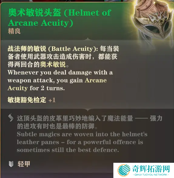 该头盔能提升武器伤害的同时增加法术的成功率,非常适合需要结合物理伤害与法术的职业。
