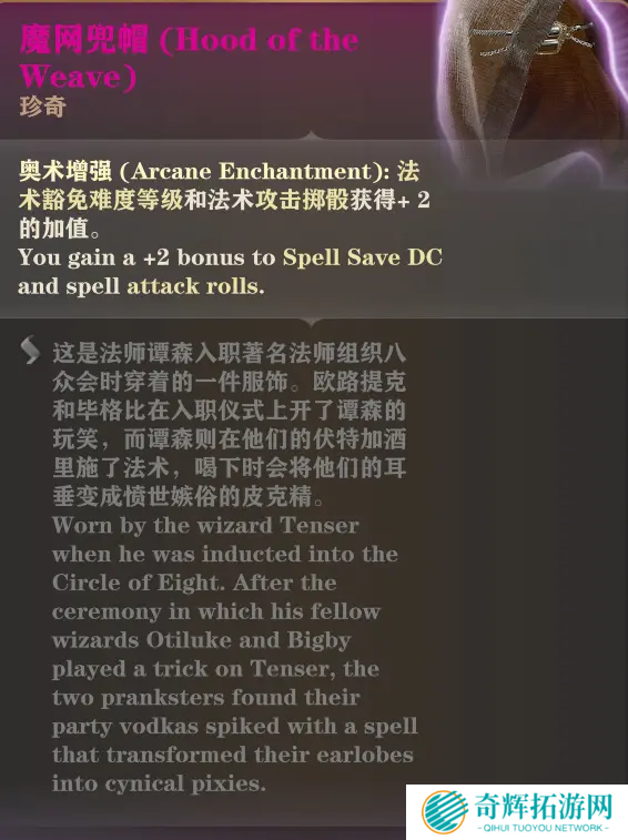 适用于法师或兼职法师职业,在过渡阶段对智力加点有一定帮助。虽然智力的检定较少,但可以帮助提升感知或体质等属性,搭配敏捷手套能让法系职业的加点更加均衡。