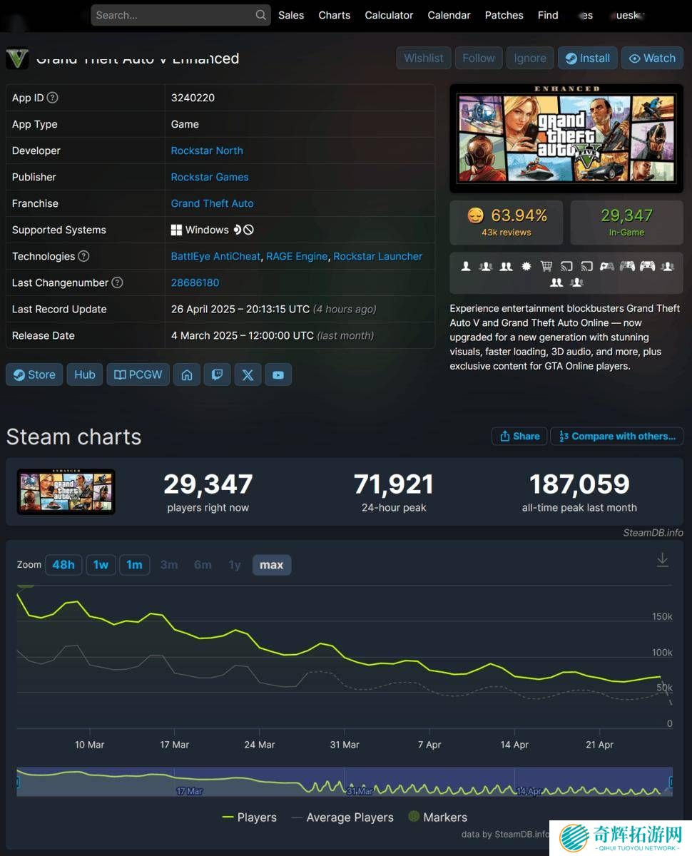 自《GTA 5 增强版》发布以来,尽管它带来了画面质量的显著提升以及更快的加载速度,但并未能如愿吸引大量PC玩家迁移。相反,原版游戏因其广泛的模组支持和稳定的功能表现,持续吸引着玩家回流。SteamDB的数据显示,增强版自首发日的18.7万峰值在线人数后,玩家数量逐渐下滑,目前已跌破7.2万,而原版则依然保有8.62万的活跃玩家。