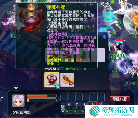 九黎的灵宝噬魔神壶和大唐的灵宝断穹巨剑类似,都可以对目标造成真实伤害,从实战效果来看,神威组的九黎灵宝可以轻松造成5000+真实伤害,配合魔王的输出可以快速将国标的关键门派点杀或打残,让国标体系被迫进入防守状态。