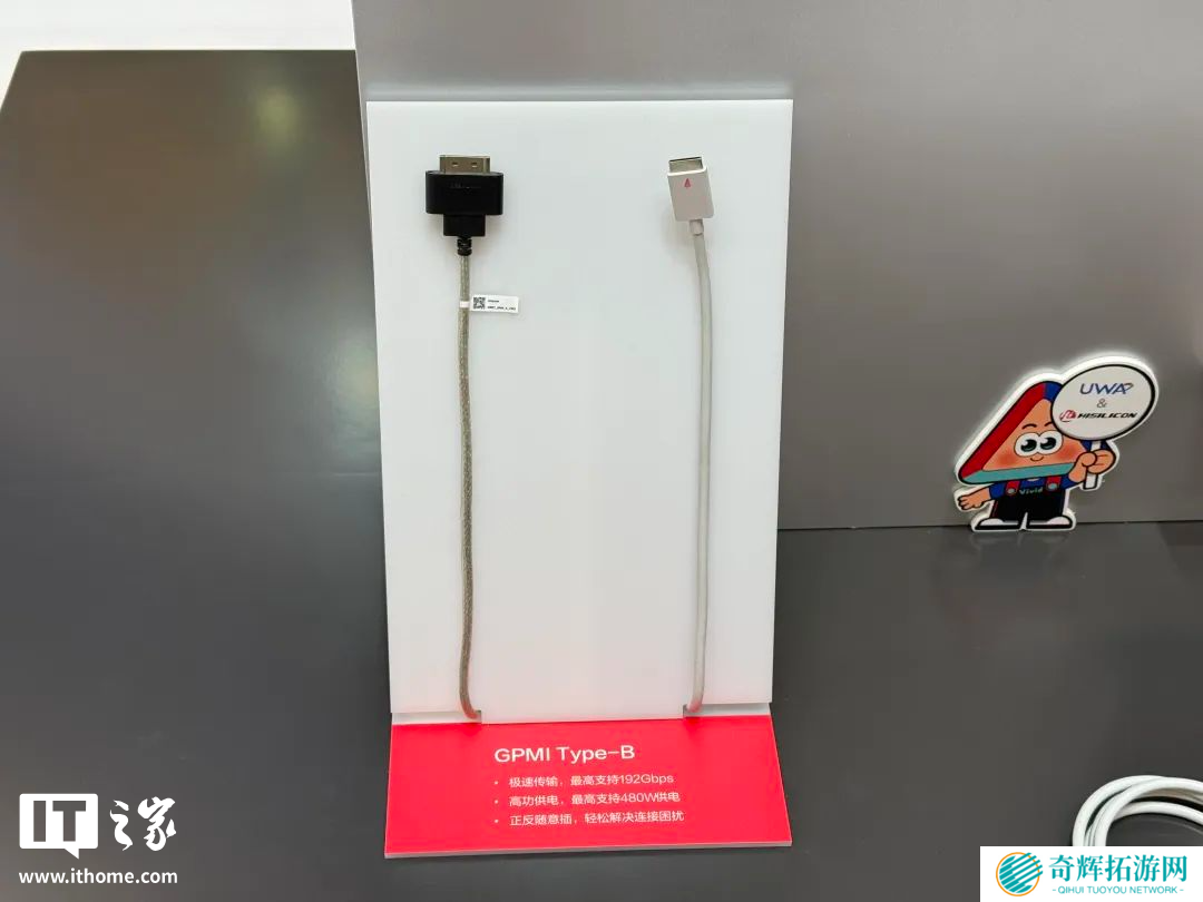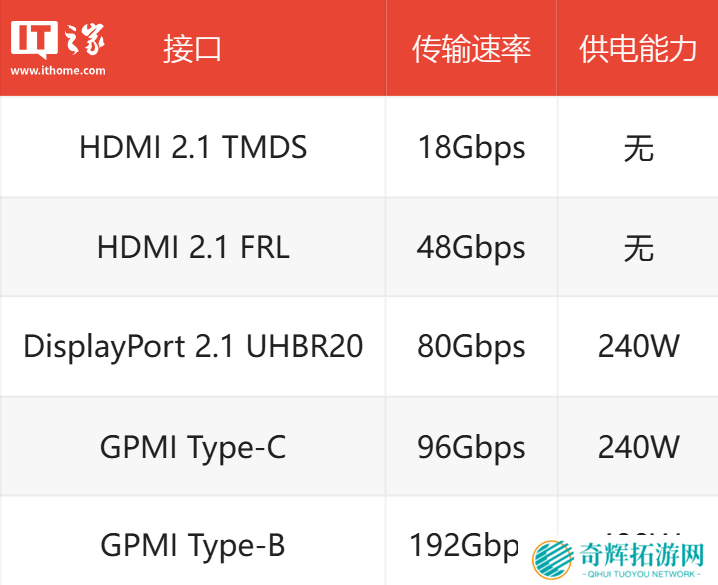 与 USB Type-C 接口兼容的 GPMI Type-C 接口,最高可支持 96Gbps 的数据传输和 240W 的电力传输。体积更大的 GPMI Type-B 接口同样支持正反插,最高可提供192Gbps 的数据带宽和 480W 的供电能力。本站附接口规格对比如下: