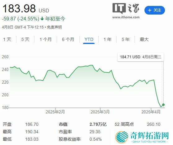 苹果股价当前报 184 美元,较 52 周高点 260.10 美元下跌 29.26%,年初至今下跌 24.55%,当前市值 2.79 万亿美元(现汇率约合 20.43 万亿元人民币)。