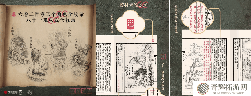 全书精心策划为六卷,依次为“火照黑云”、“风起黄昏”、“夜生白露”、“曲度紫鸢”、“日落红尘”及“未竟”,详尽收录了游戏中出现的203个角色,涵盖小妖、头目、妖王及人物等各类形象。每个角色均配以赞词、画像及小传,无论是籍籍无名的小妖,还是声名显赫的妖王,其性格特征、情感纠葛及命运波折均跃然纸上。
