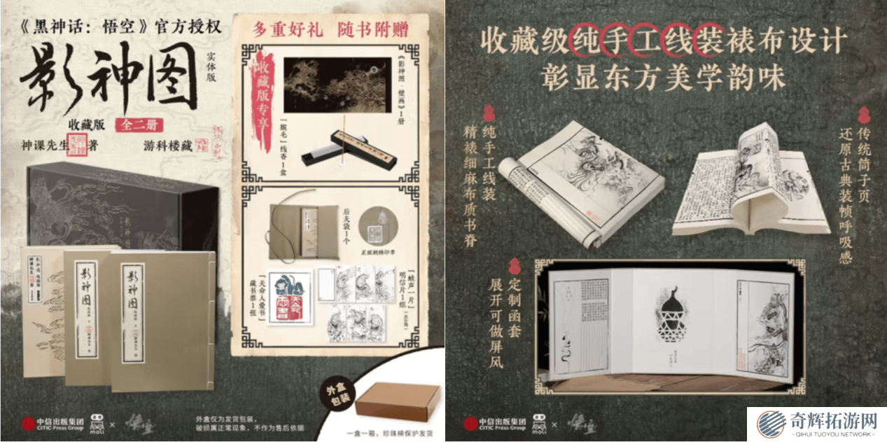 精装版《影神图》采用硬壳精装、书脊裱布及裸脊锁线工艺,可180°平摊阅读,性价比极高。随书附赠刺绣后天袋、藏书票及明信片,满足玩家的日常鉴赏需求。而收藏版则更为豪华,采用纯手工线装、传统筒子页及布面烫金屏风函套,售价268元。除包含精装版全部赠品外,还额外附赠《影神图·壁画》及“猴毛”线香。值得注意的是,收藏版限时销售,有意购买的读者需在5月20日前下单。