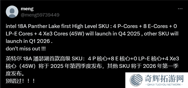 然而,关于PantherLake系列的具体信息仍存在一些不确定性。完整的SKU阵容可能要到2025年底才会完全明朗。尽管如此,无论是传闻还是官方信息都一致确认,今年内将推出首个PantherLake平台版本。