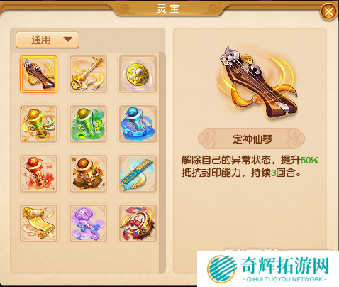 定神仙琴一般是封系使用较多,解除自己的异常状态,提升50%抵抗封印能力,持续3回合,在一些凭封印的回合数时比较好用。