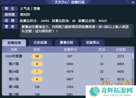 除此之外,【′天天开心°】的发展也非常值得关注。虽说该帮派未能在2024年度赛中拿到好成绩,但其在届赛中的表现非常突出,再加上他们吸纳了不少此前在【江湖】效力的活跃队伍,其硬实力势必会有较为明显的提升。? ?? ???由此可见,2024年度赛已经成为新势力帮派补强自己、提升实力的关键时机。这些新势力的涌现,势必会给帮派联赛带来更多的不确定性和观赏性,我们期待着在未来的联赛中,能够看到更多精彩的比赛和更加多元化的格局。