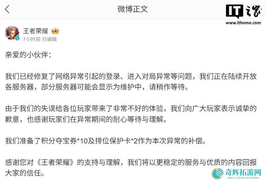 在公告中,官方还向所有受到影响的玩家表达了诚挚的歉意,并感谢他们在异常期间的耐心等待与理解。为了弥补这次失误给玩家带来的不便,官方决定提供积分夺宝券10张以及排位保护卡2张作为补偿。