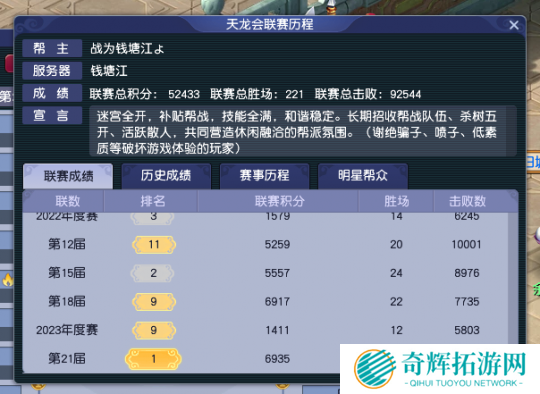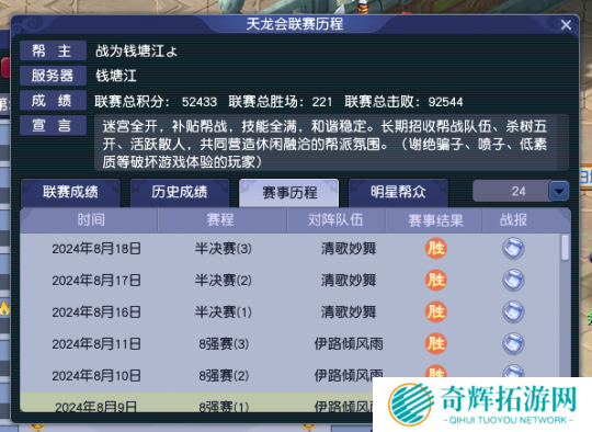 【天龙会】算是一个老牌强帮,曾在2022年年度赛中,就拿到了全服第三的好成绩。经历为期一年的修整、招募之后,于2024年成功圆梦冠军。值得一提的是,钱塘江有三个实力极强的帮派,成绩都基本稳定在每届16强左右,是一个区内帮战力量极强的服务器。