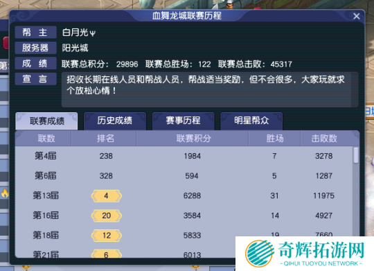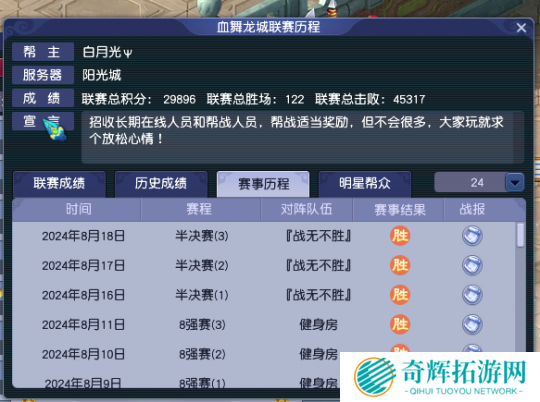 【幻¢城】解散后,【血舞龙城】仿佛焕发新生,在第24届帮派联赛中不仅接**胜【天下】、【健身房】和『战无不胜』,还以全胜姿态挺进决赛。这一次的决赛,他们势必会整合区内剩余力量,带领阳光城玩家再度冲击冠军。