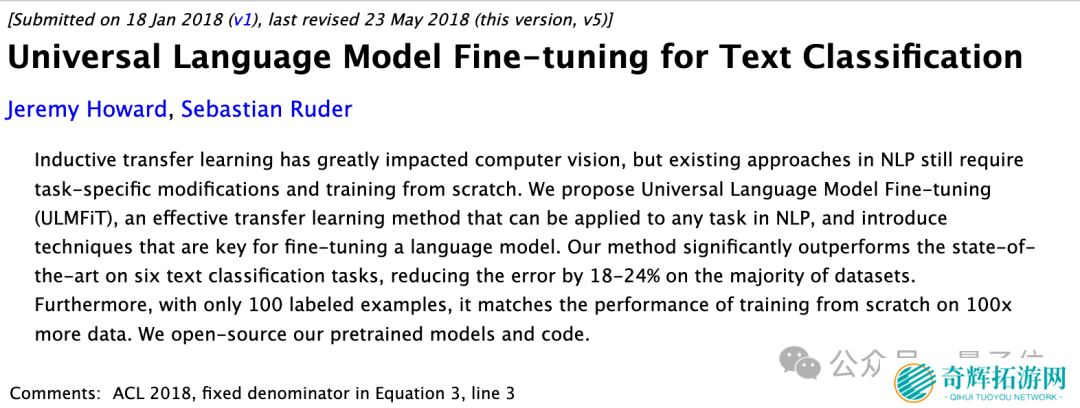 首先来介绍一下 ULMFiT 这篇论文,入选 ACL 2018: