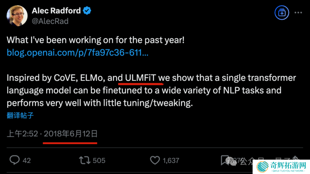 甚至 GPT-1 的一作 Alec Radford,在发表 GPT-1 时也公开承认过 ULMFiT 是灵感来源之一。