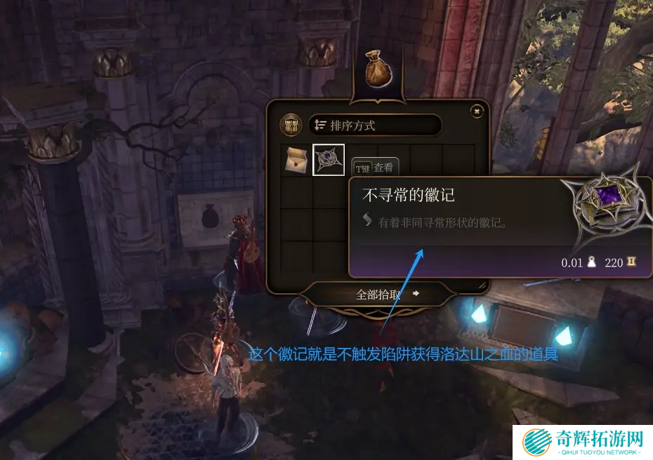 1、当你成功摆放完武器后,石板门会打开,里面的袋子里就藏着不寻常的徽记了。