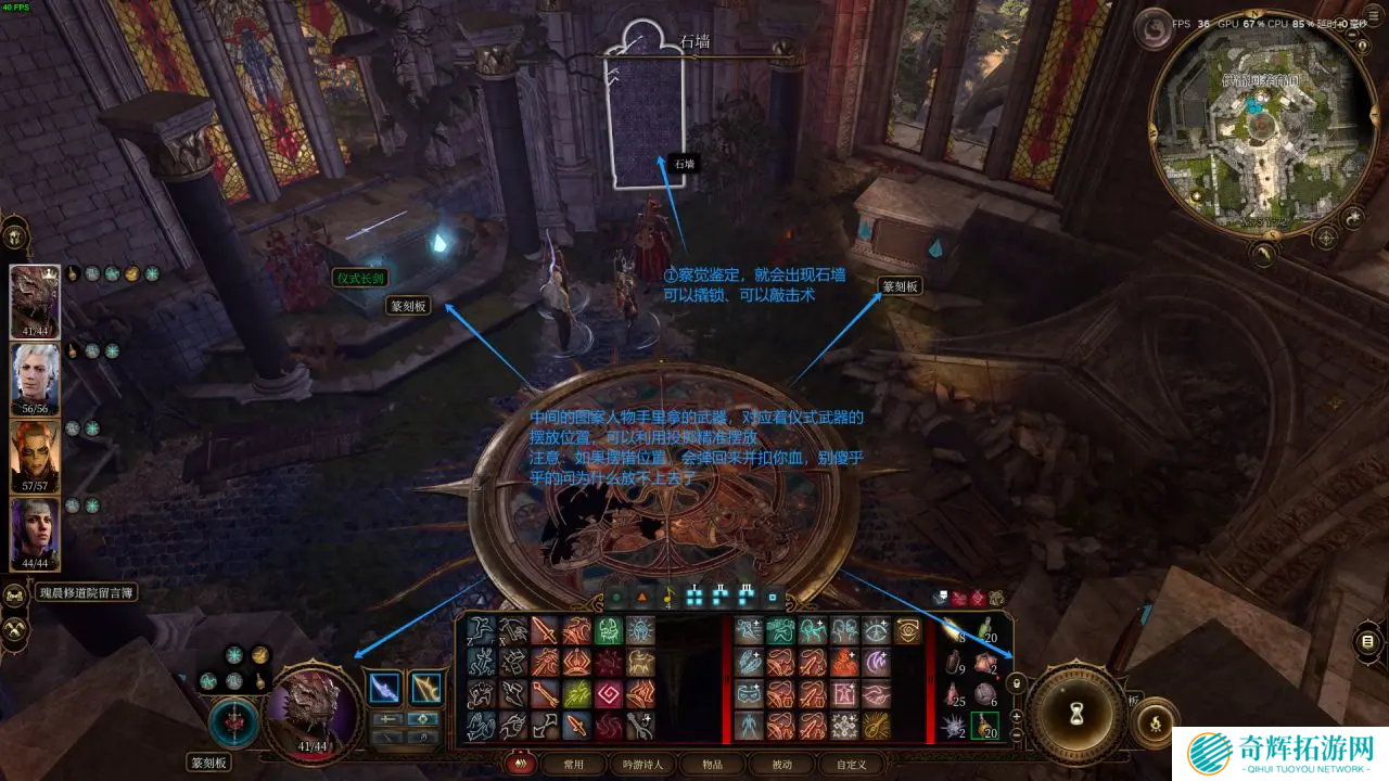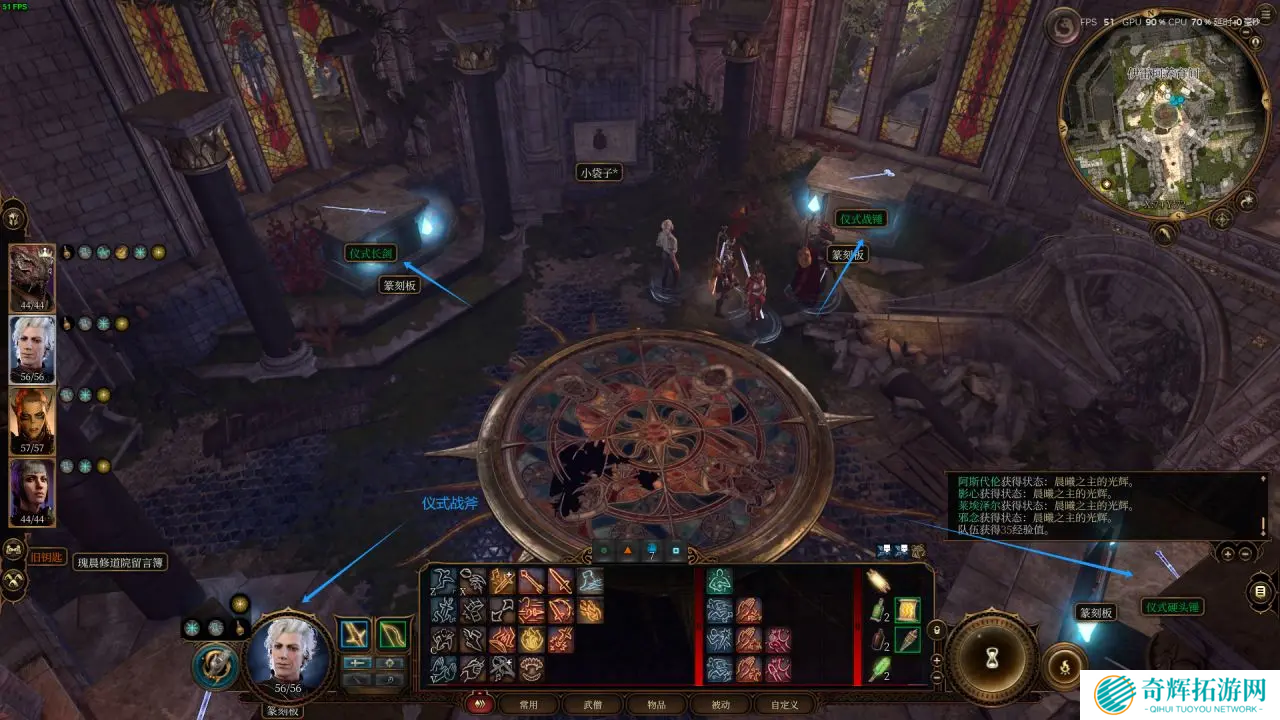 3、摆放的线索就在大厅中央的大地板图案上,记住,人物手中拿的是什么武器,就将该武器放在对应的祭坛上。