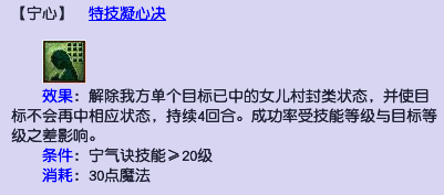 天宫还可以使用“宁心”技能解除女儿村的封印技能,被“宁心”解封后,可以让目标在4回合内免受相应状态影响,极大的降低了以“双女儿”为核心阵容的控制优势。