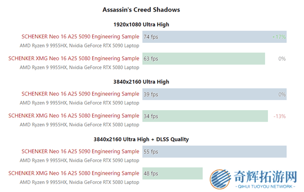 值得注意的是,无论是在启用还是未启用DLSS(深度学习超级采样)技术的情况下,RTX 5080与RTX 5090之间的性能差距都保持相对稳定。例如,在启用DLSS运行《刺客信条:影》时,RTX 5090仍然能够保持对RTX 5080约15%的性能优势。