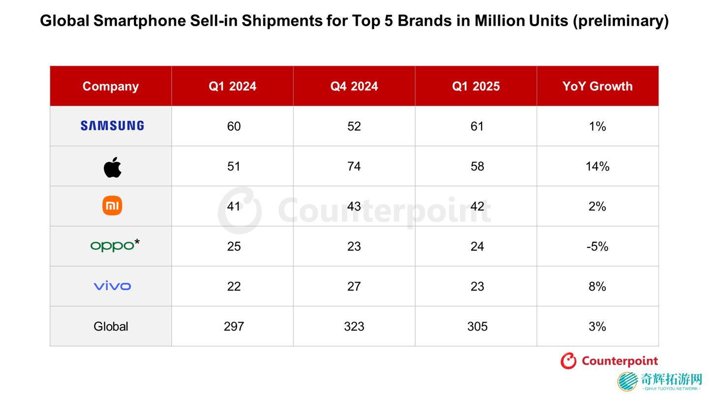 本站 4 月 17 日消息,市场调查机构 Counterpoint Research 昨日(4 月 16 日)发布博文,报道称 2025 年第 1 季度全球智能手机出货量同比增长 3%,中国、拉丁美洲和东南亚市场的需求激增成为主要推动力。