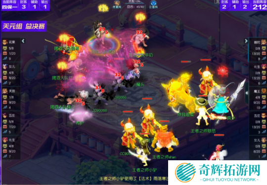 比赛第31回合,喝酒大队试图拉出谛听冲刺,但由于谛听速度较慢,被王者之师的咒师普陀直接砸掉。除此之外,王者之师的魔王寨非常给力,一波秘传飞沙走石瞬秒了喝酒大队女儿村,成功打断对手控制节奏。