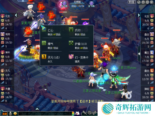 比赛前期,荃美月好试图用善恶攻宠摧毁王者之师防线,但由于王者之师整体抗性不错,仅牺牲了魔王寨一人。同时,在双盘丝的压制下,荃美月好化生寺的仁心层数几乎为零,这对于已经进行了15回合的比赛来说严重滞后。