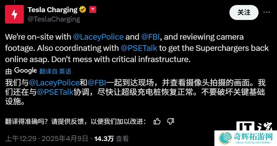 本周二,特斯拉在其 X 平台的充电账号上表示,公司已与当地警方以及联邦调查局(FBI)一同前往华盛顿州莱西市的一个超级充电站。据称,该站点的变压器在爆炸中被摧毁。特斯拉方面表示:“我们正在现场与莱西警方和联邦调查局一起查看监控录像,同时也在与普吉特湾能源公司协调,争取尽快恢复超级充电站的运营。不要破坏关键基础设施。”