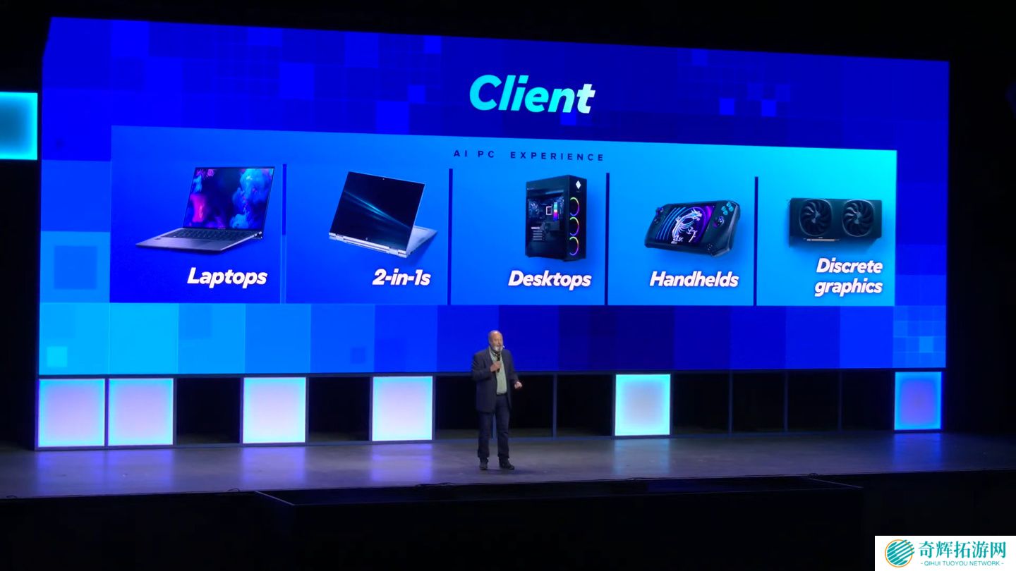 本站注意到,Jim Johnson 所展示的另一张幻灯片显示掌机设备、独立显卡均位于英特尔客户端 AI PC 产品类目中。