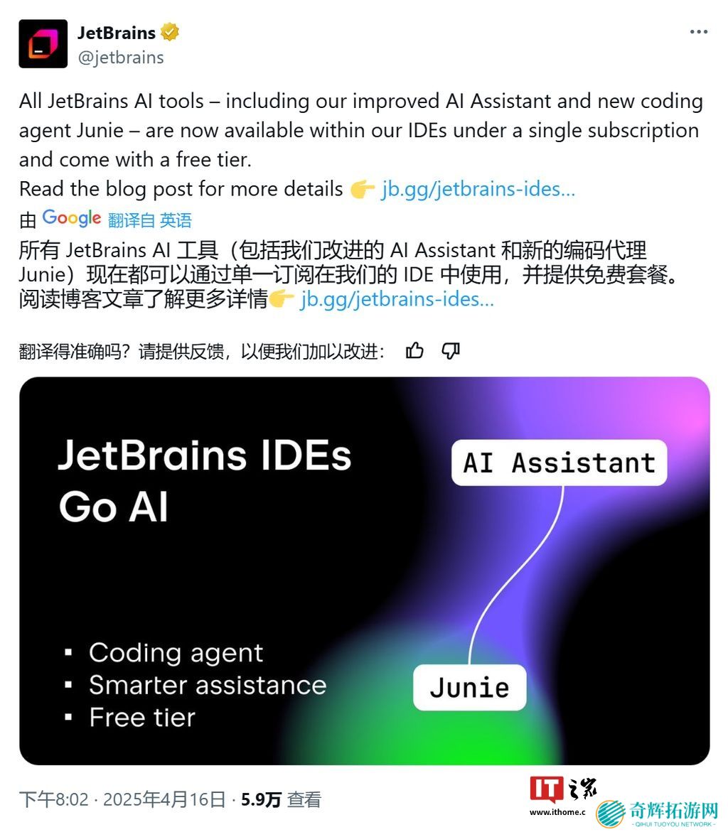 本站 4 月 17 日消息,JetBrains 昨日(4 月 16 日)发布公告,宣布其 Junie AI 编码智能体已进入“生产就绪”(production-ready)状态,能处理编写代码和调试运行等多步骤任务。