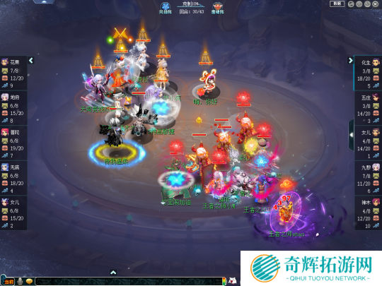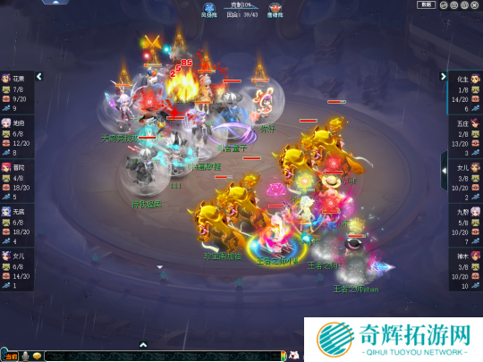 比赛前中期,【天湾竞技】不仅凭借极强的回复能力顶住了【王者之师】的进攻,还靠着花果山高额的单点伤害不断清宠,逐渐建立优势。比赛第30回合时,【天湾竞技】拉出攻谛听,接连打出【王者之师】神木林身上的“163”神佑,大大降低了对手容错率,只要抓到机会来波点杀,就能形成“以多打少”的局面。